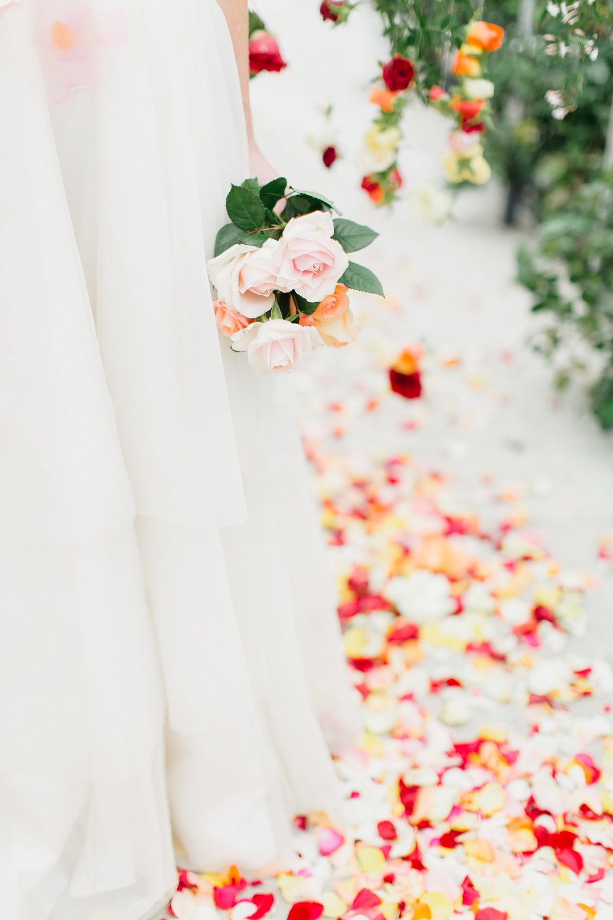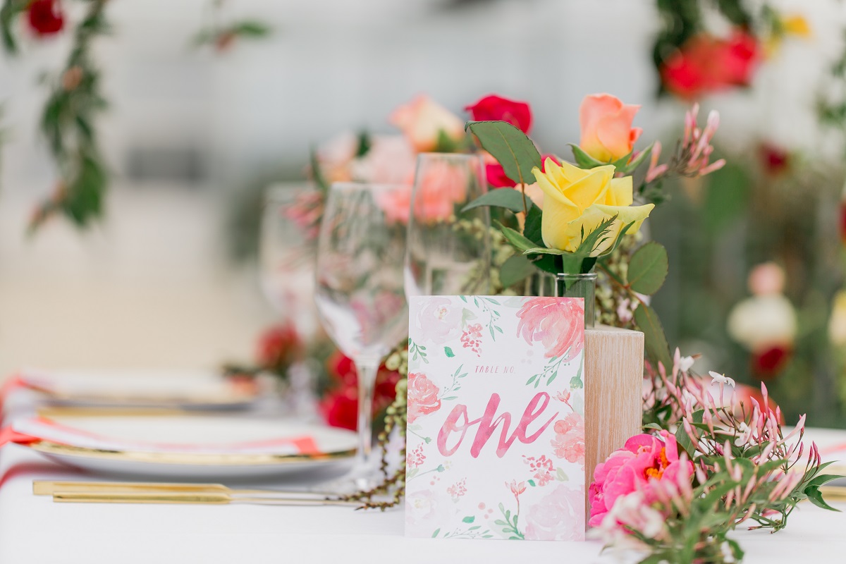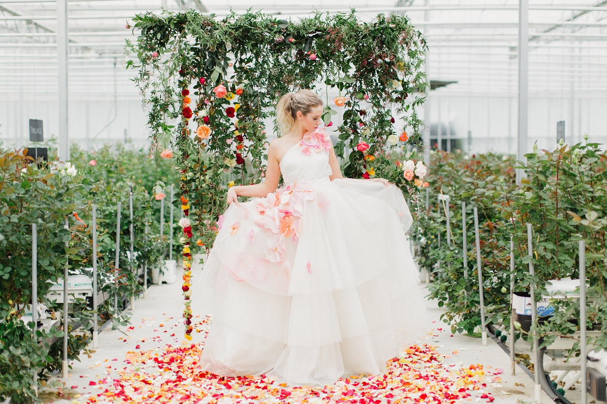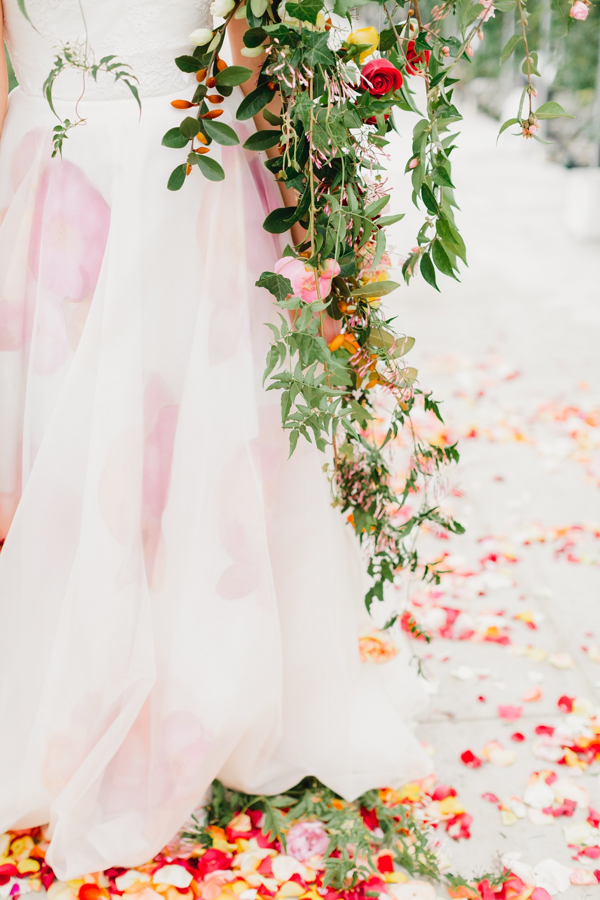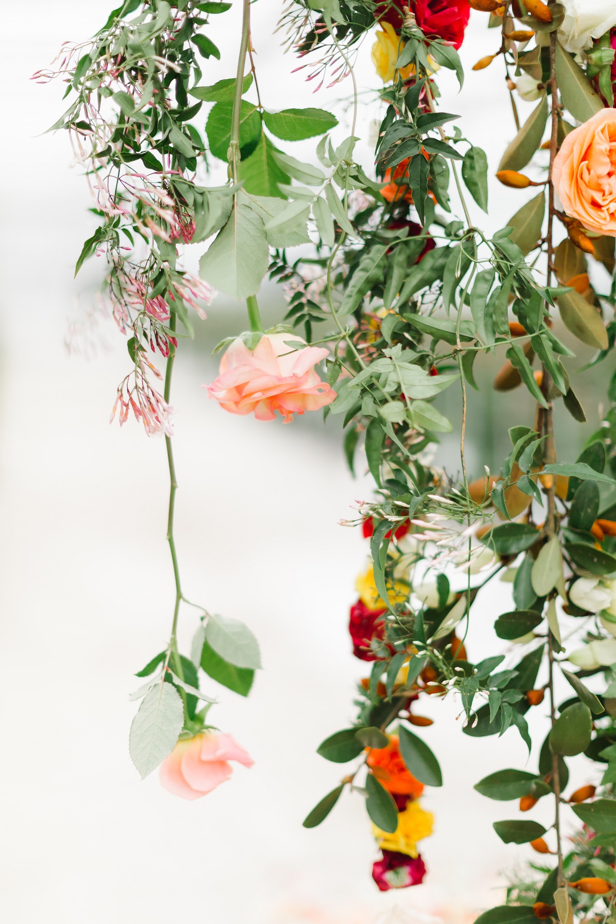 Rows of fresh blooms, trailing jasmine and suspended florals, hand-painted silk, watercolour, fun, vibrance and joy.