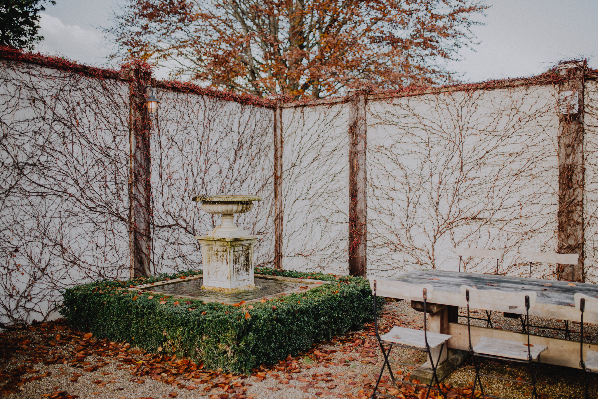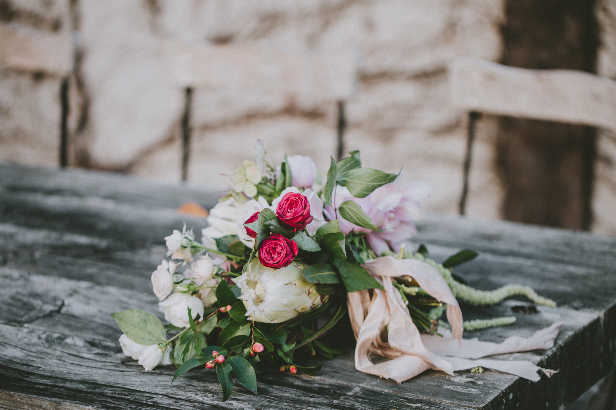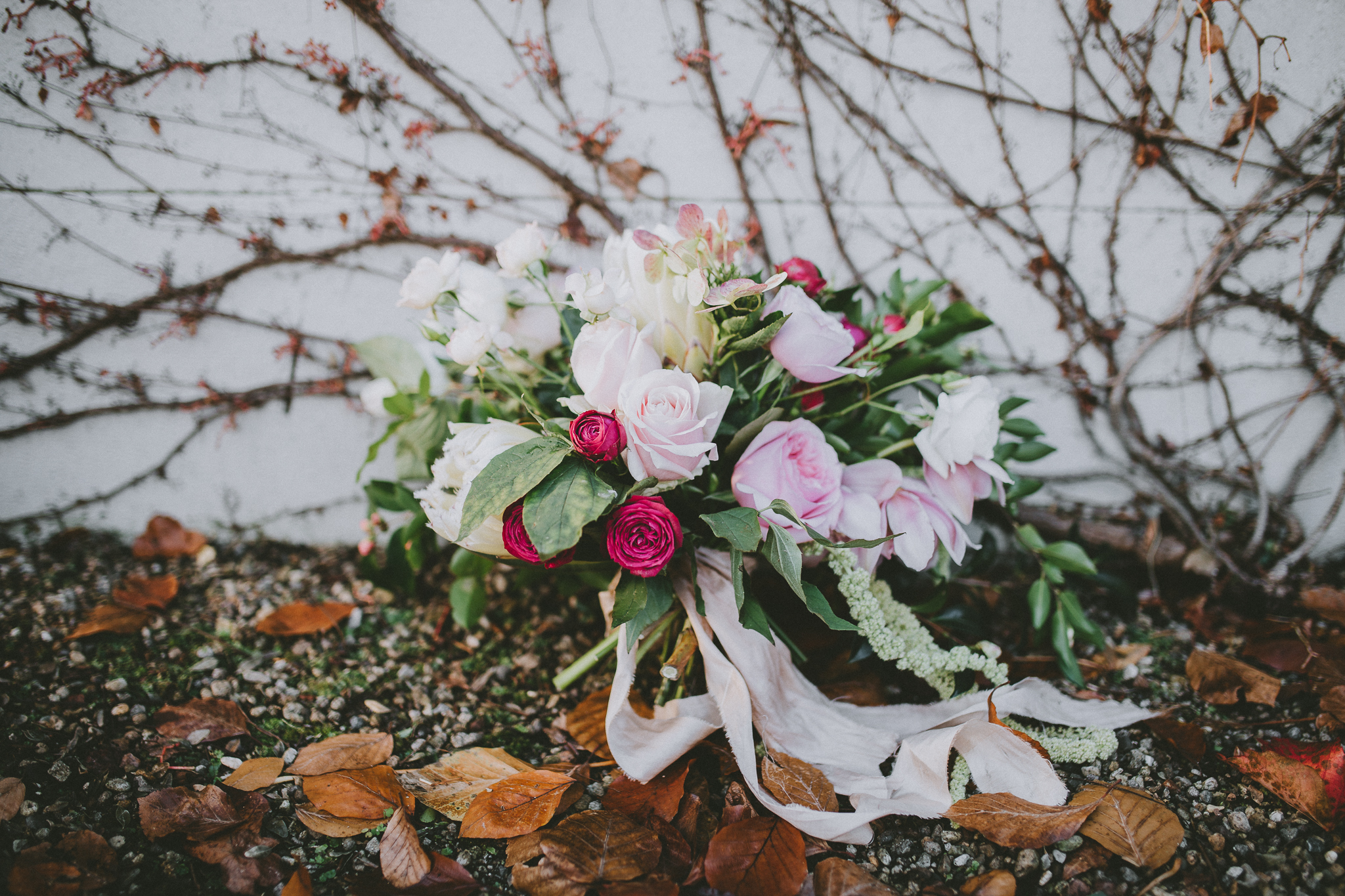Bare vines snaking over stone walls, fallen leaves, rich pink, velvety protea, marbled cake, fireplace, opulence, candles and trailing silk.