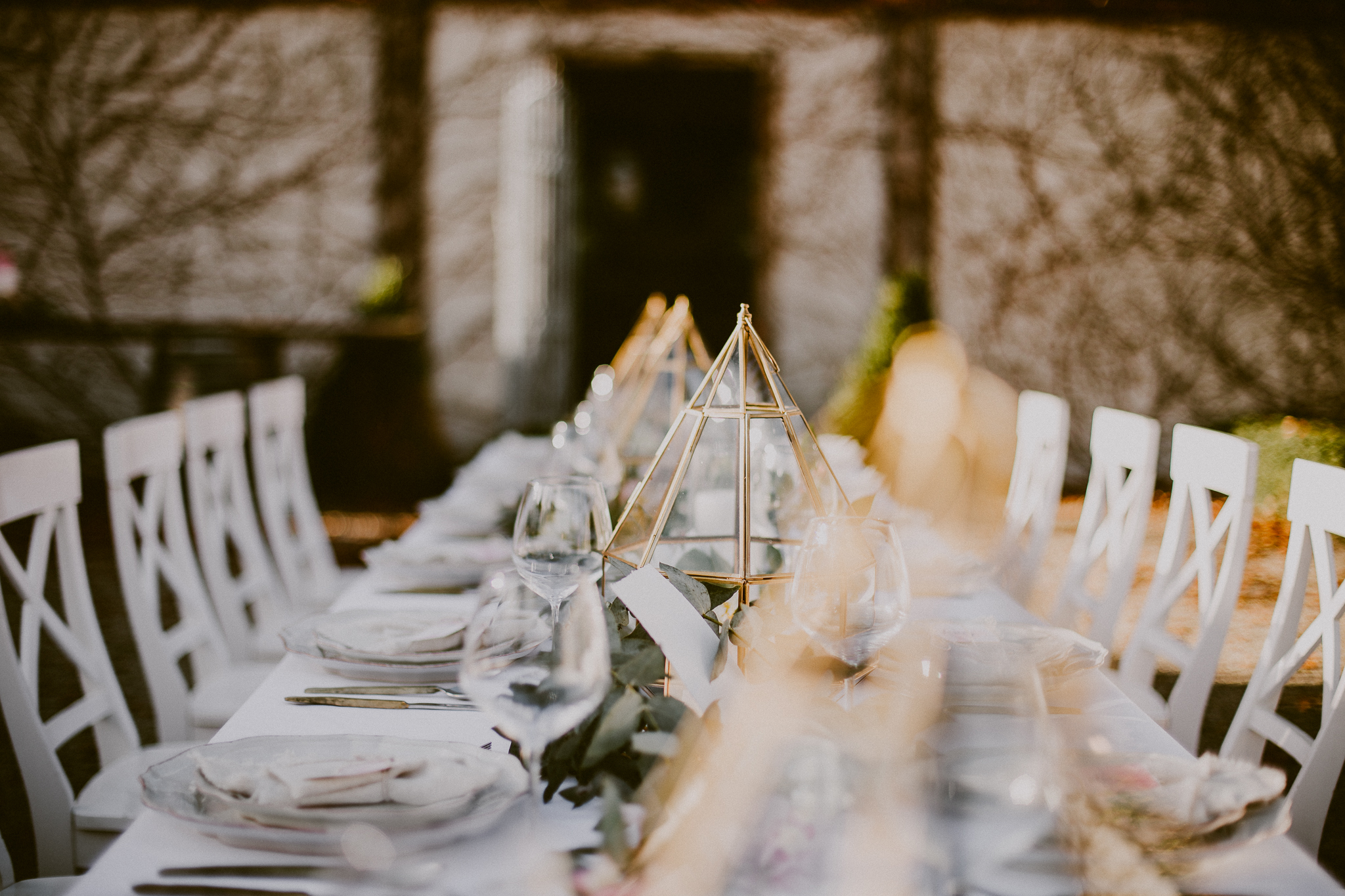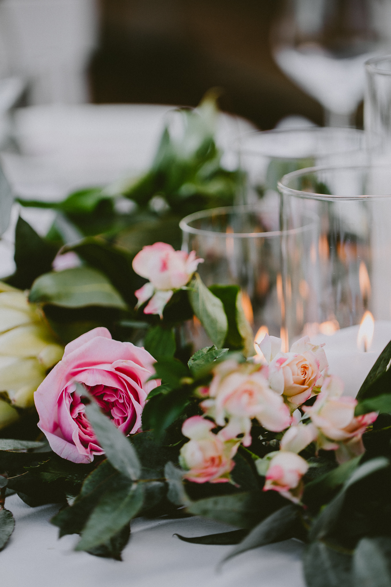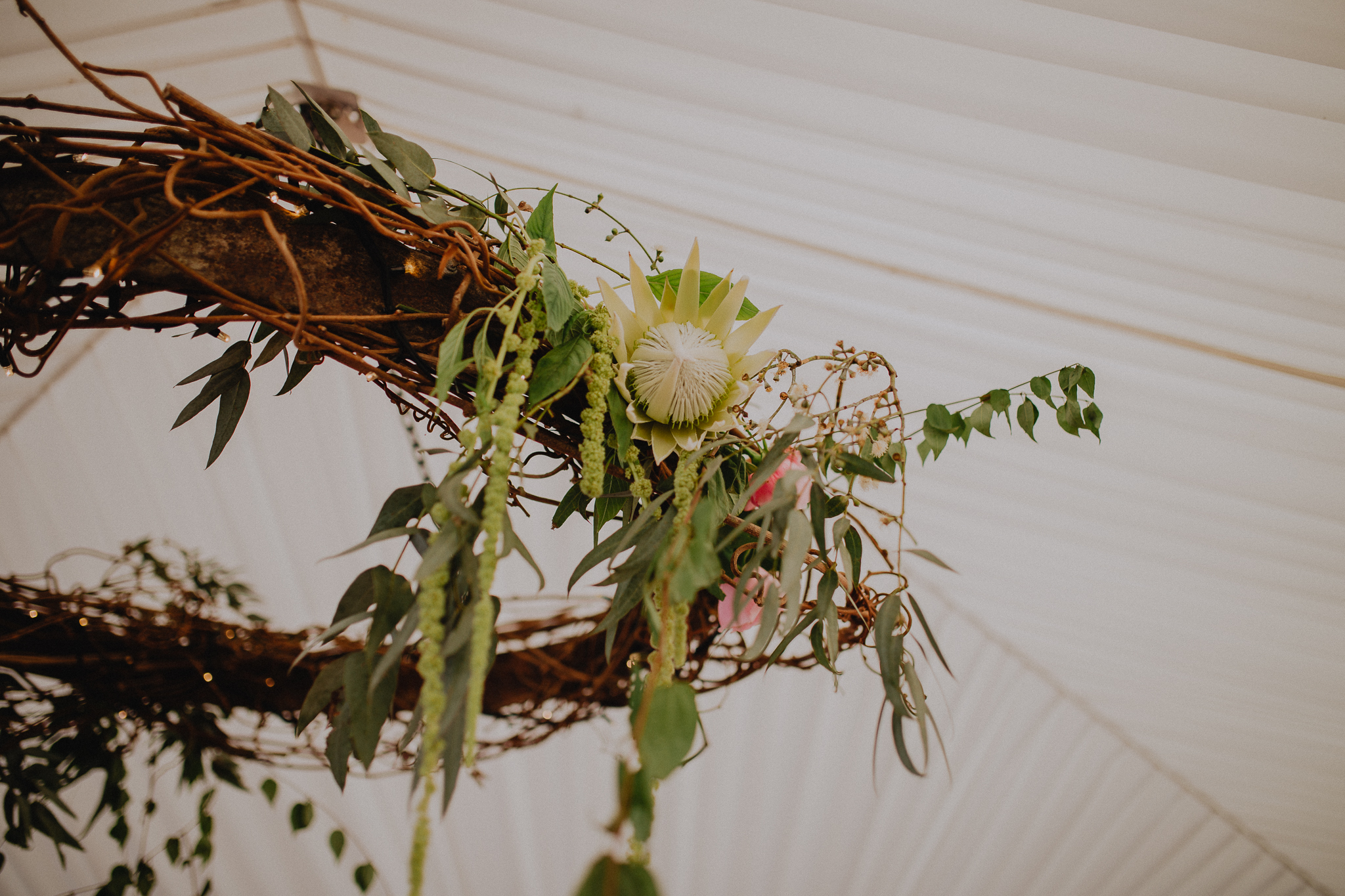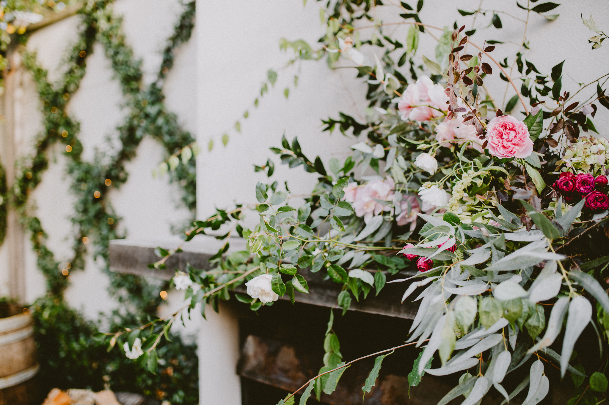 Bare vines snaking over stone walls, fallen leaves, rich pink, velvety protea, marbled cake, fireplace, opulence, candles and trailing silk.
