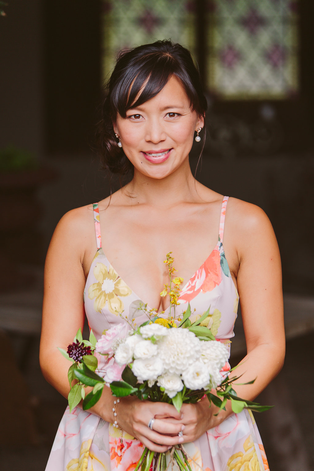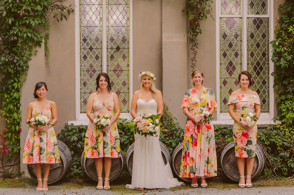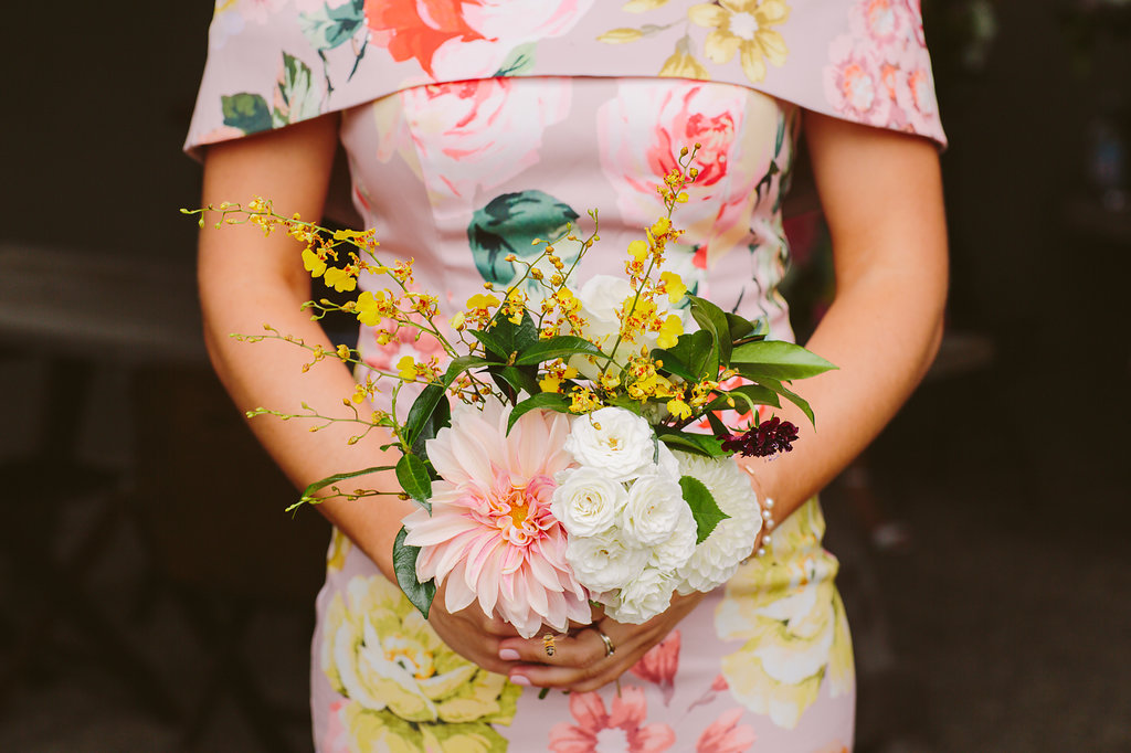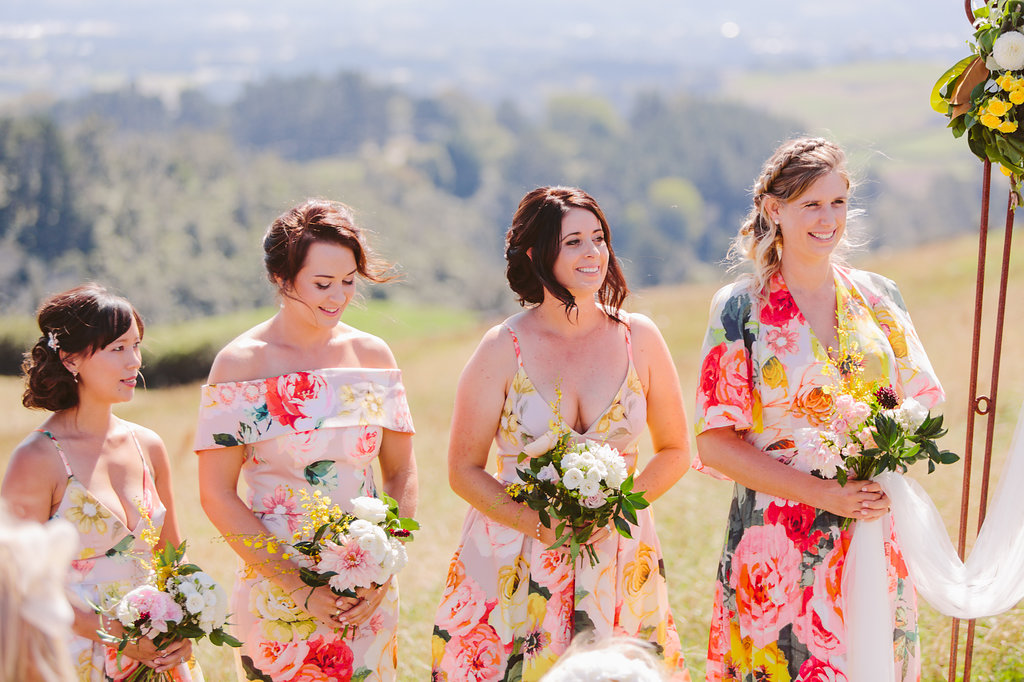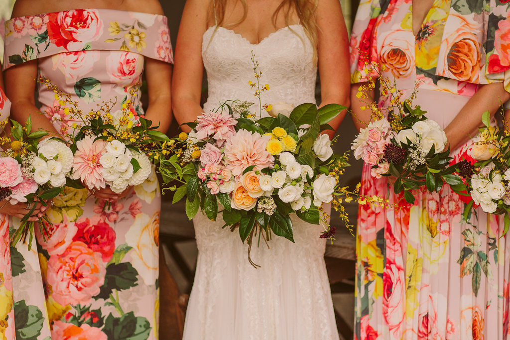 Sometimes the colour of your bridesmaids’ dresses REALLY sets the colour palette for your wedding flowers. Nadia chose the coolest bold floral print dresses for her girls…. I loved these dresses! We both agreed that as the dresses were such a statement in themselves that the girls flowers needn’t be too overwhelming…. instead we made sweet posies for the girls and a statement bouquet for Nadia. It was lovely to have a pop of yellow within the florals, I always love using stems of gorgeous bright dancing lady orchids, they truly reflect the joy of this super chilled fun-loving couple.