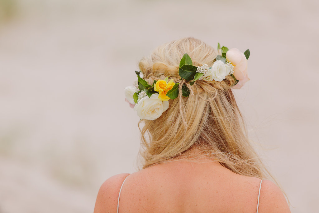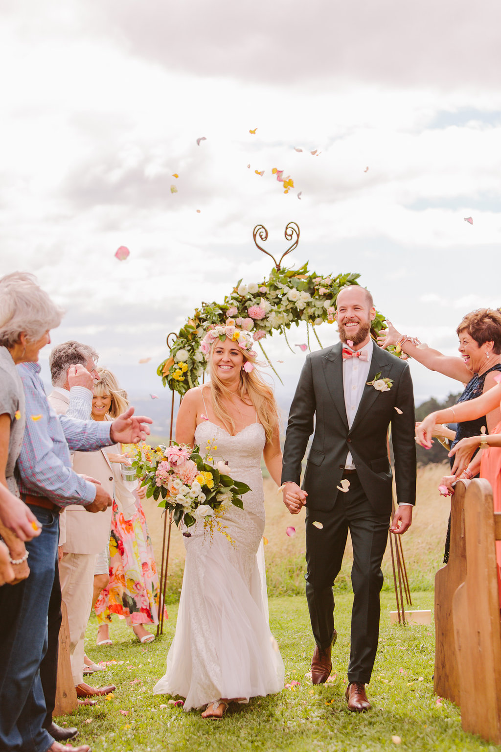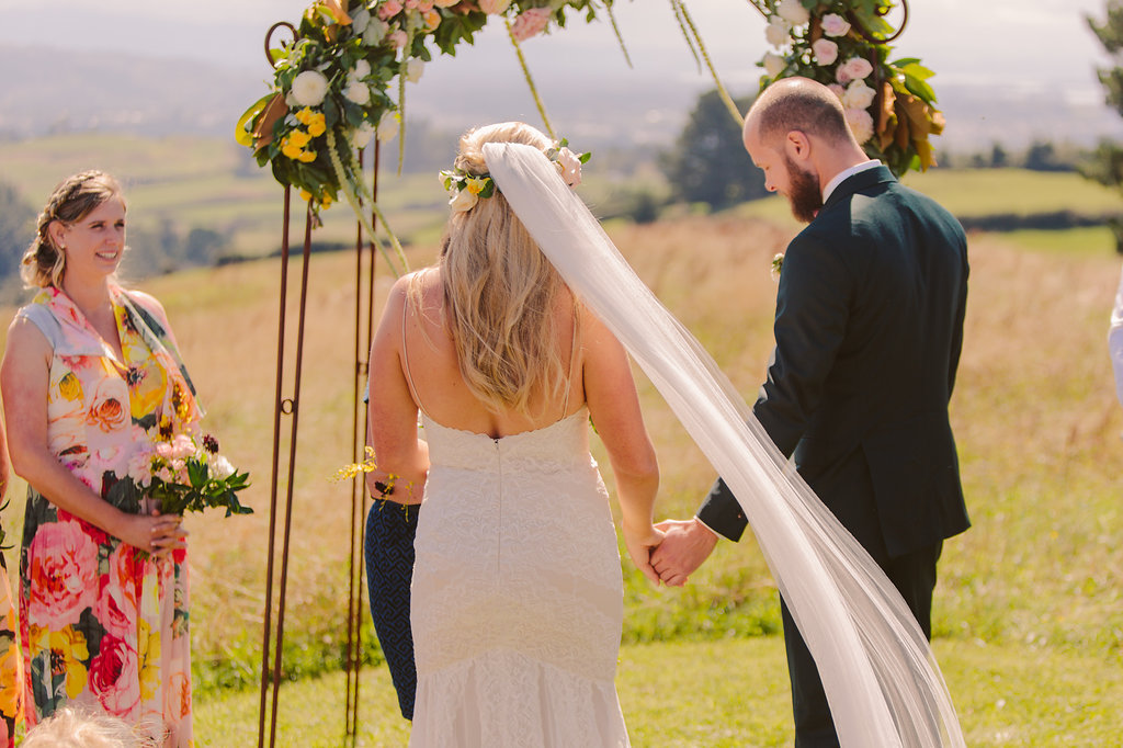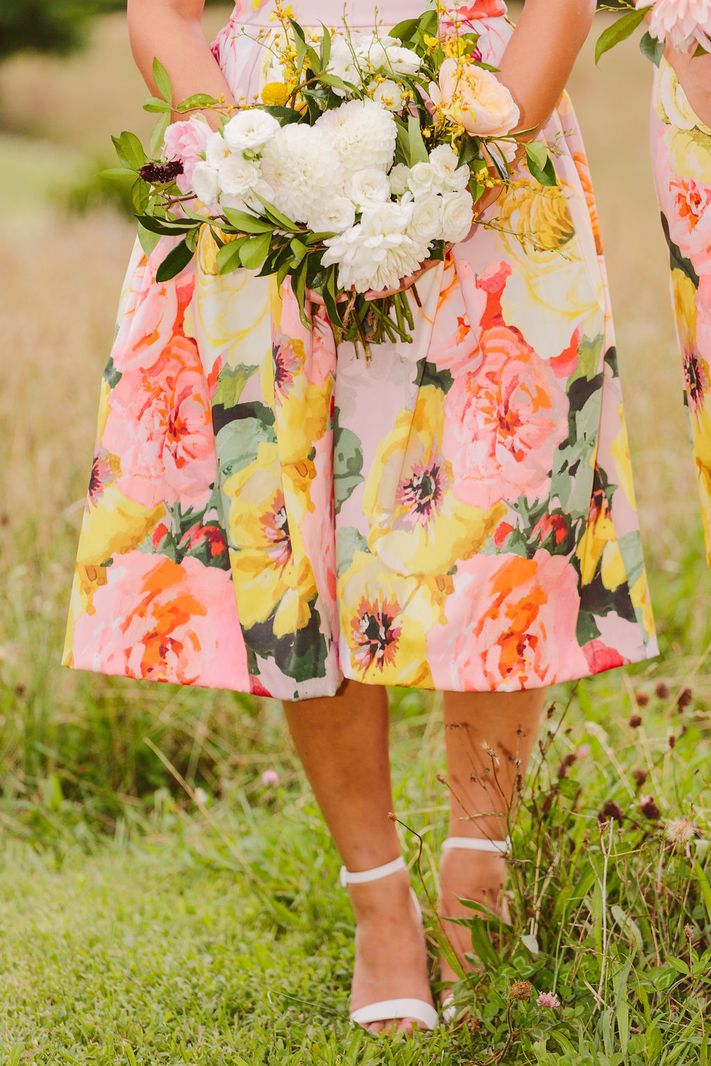 Sometimes the colour of your bridesmaids’ dresses REALLY sets the colour palette for your wedding flowers. Nadia chose the coolest bold floral print dresses for her girls…. I loved these dresses! We both agreed that as the dresses were such a statement in themselves that the girls flowers needn’t be too overwhelming…. instead we made sweet posies for the girls and a statement bouquet for Nadia. It was lovely to have a pop of yellow within the florals, I always love using stems of gorgeous bright dancing lady orchids, they truly reflect the joy of this super chilled fun-loving couple.