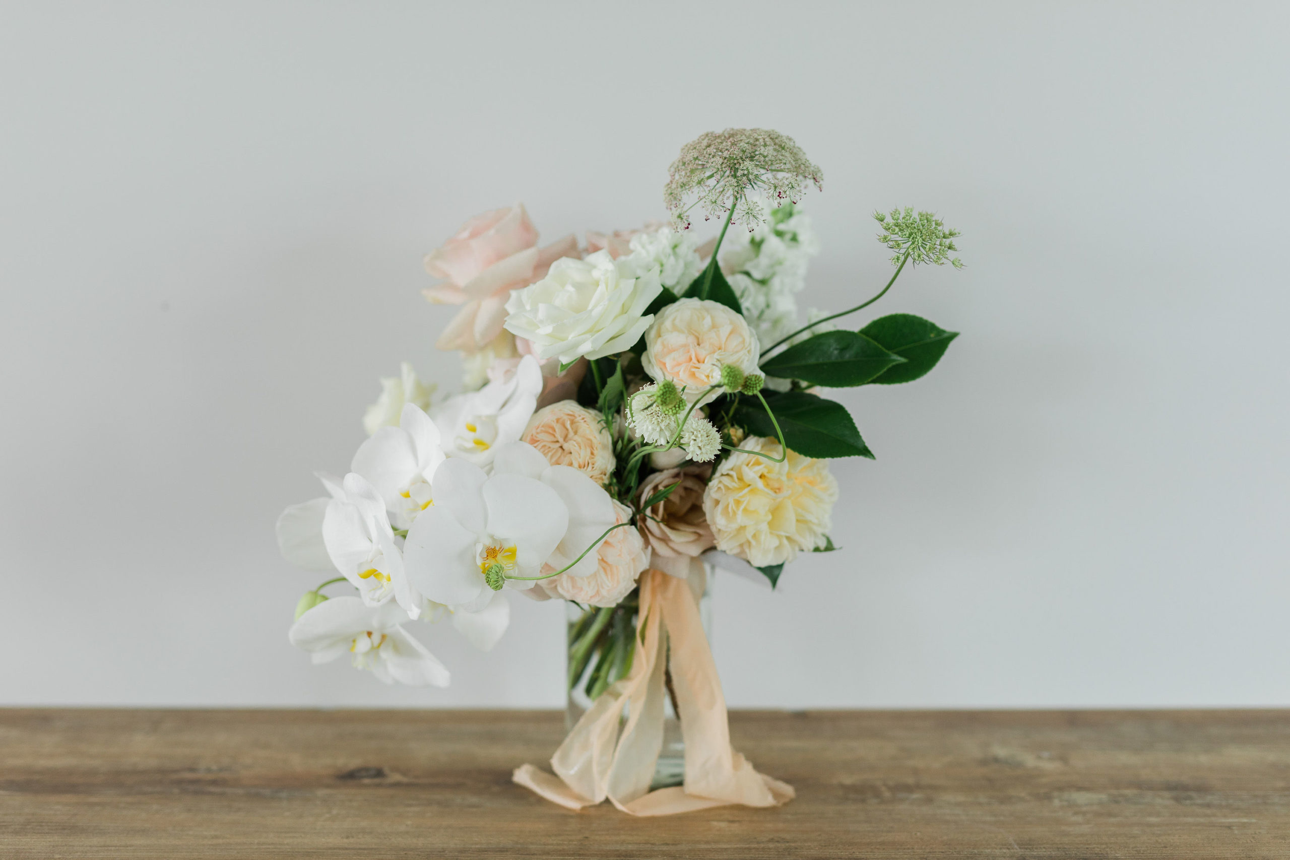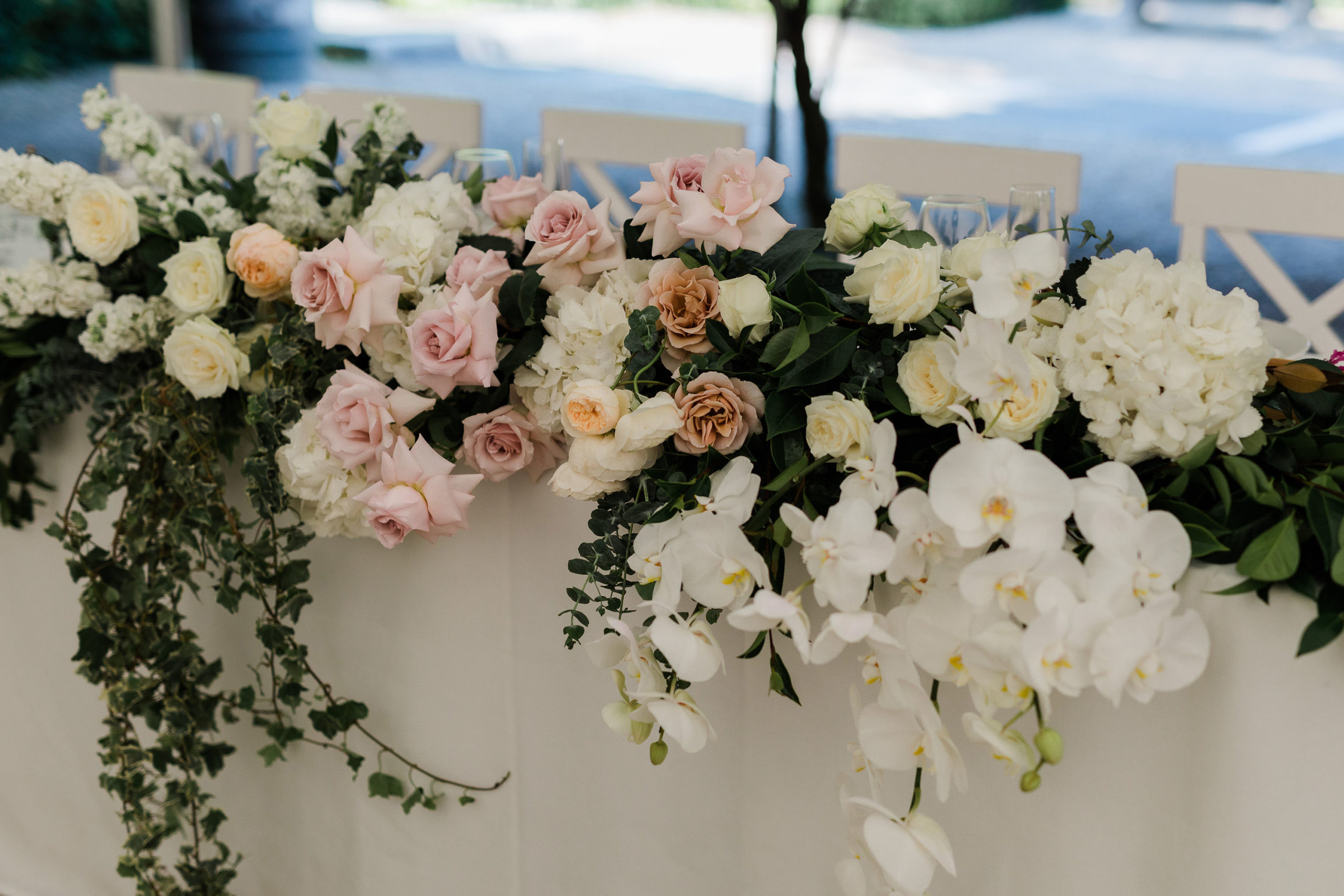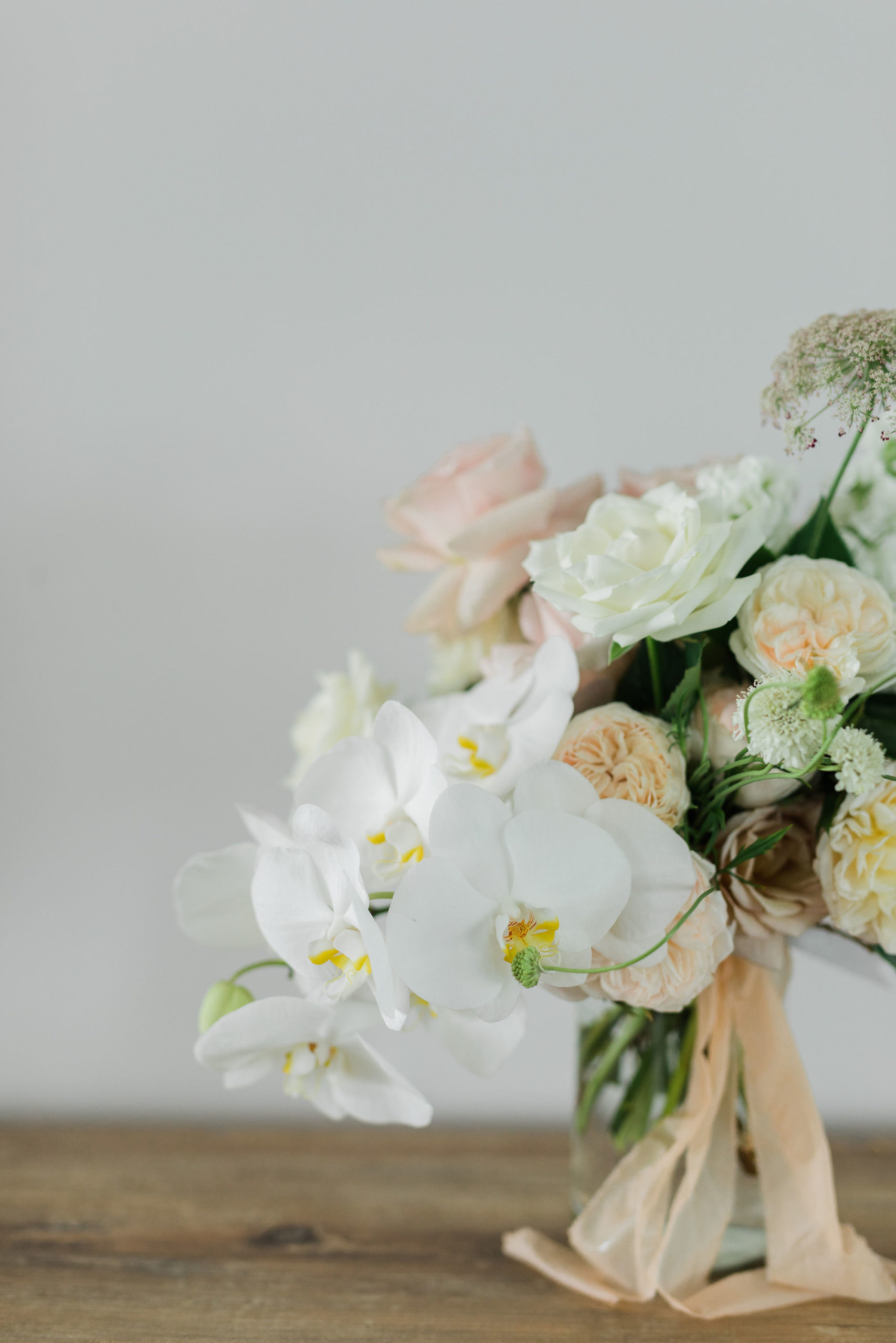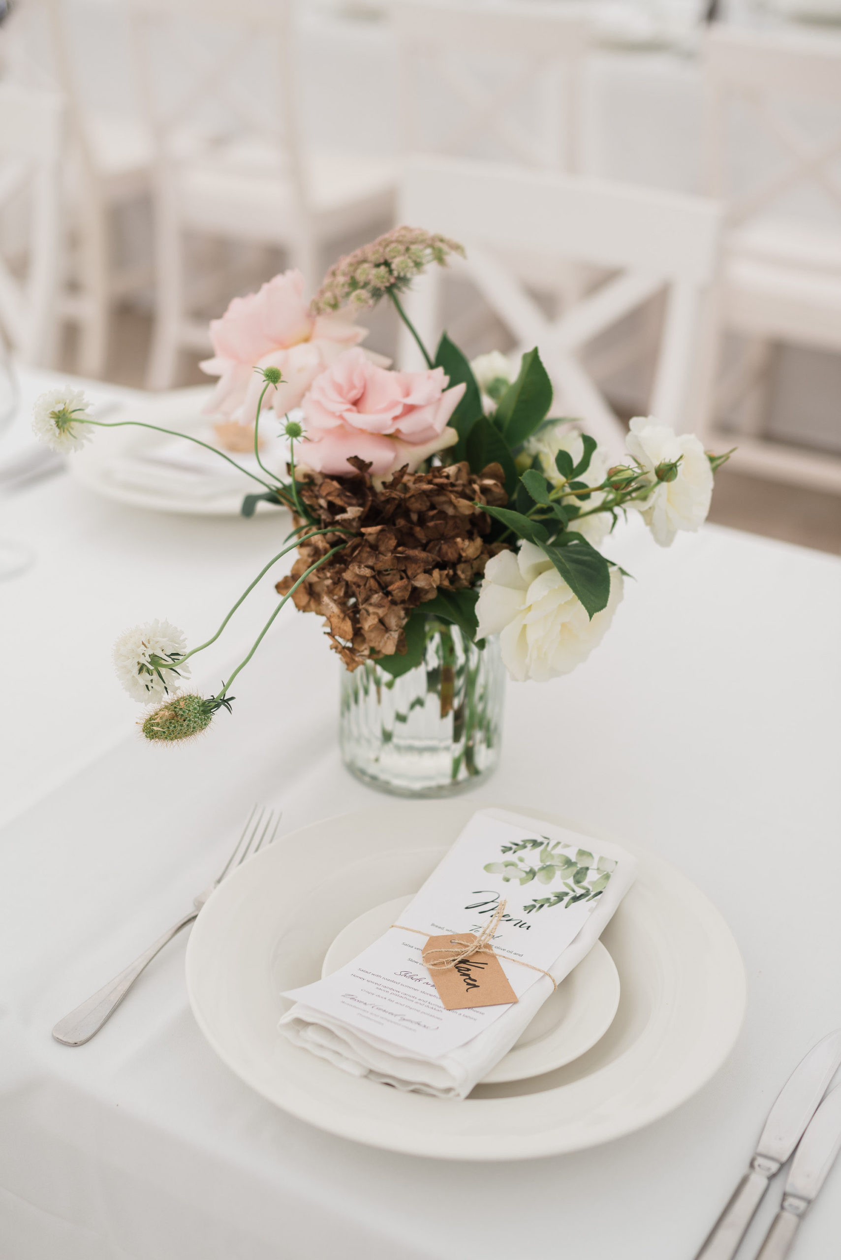 Steph wanted understated elegance for her bouquets… romantic soft roses, delicate orchids with trails of hand dyed ribbons. I created a lush arrangement for the mantelpiece that set the scene for the ceremony and worked perfectly on the head table after the ceremony. Sweet vases of seasonal bloom adorned the guest tables under a pair of fresh foliage and trailing greenery installations suspended from the hanging wreaths. Nature provided the rest of of the decoration – that stunning hydrangea walk is too dreamy.