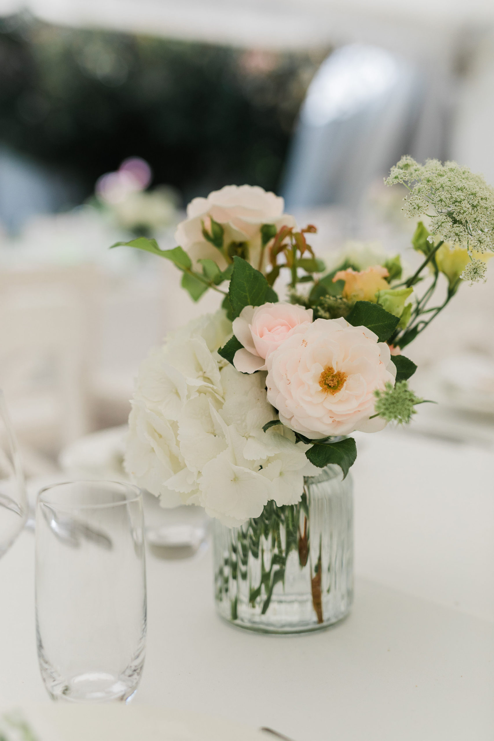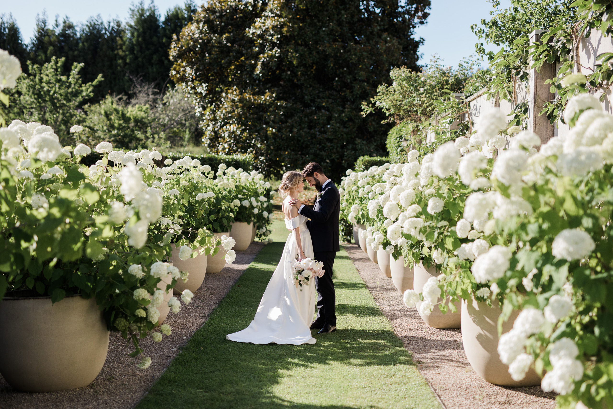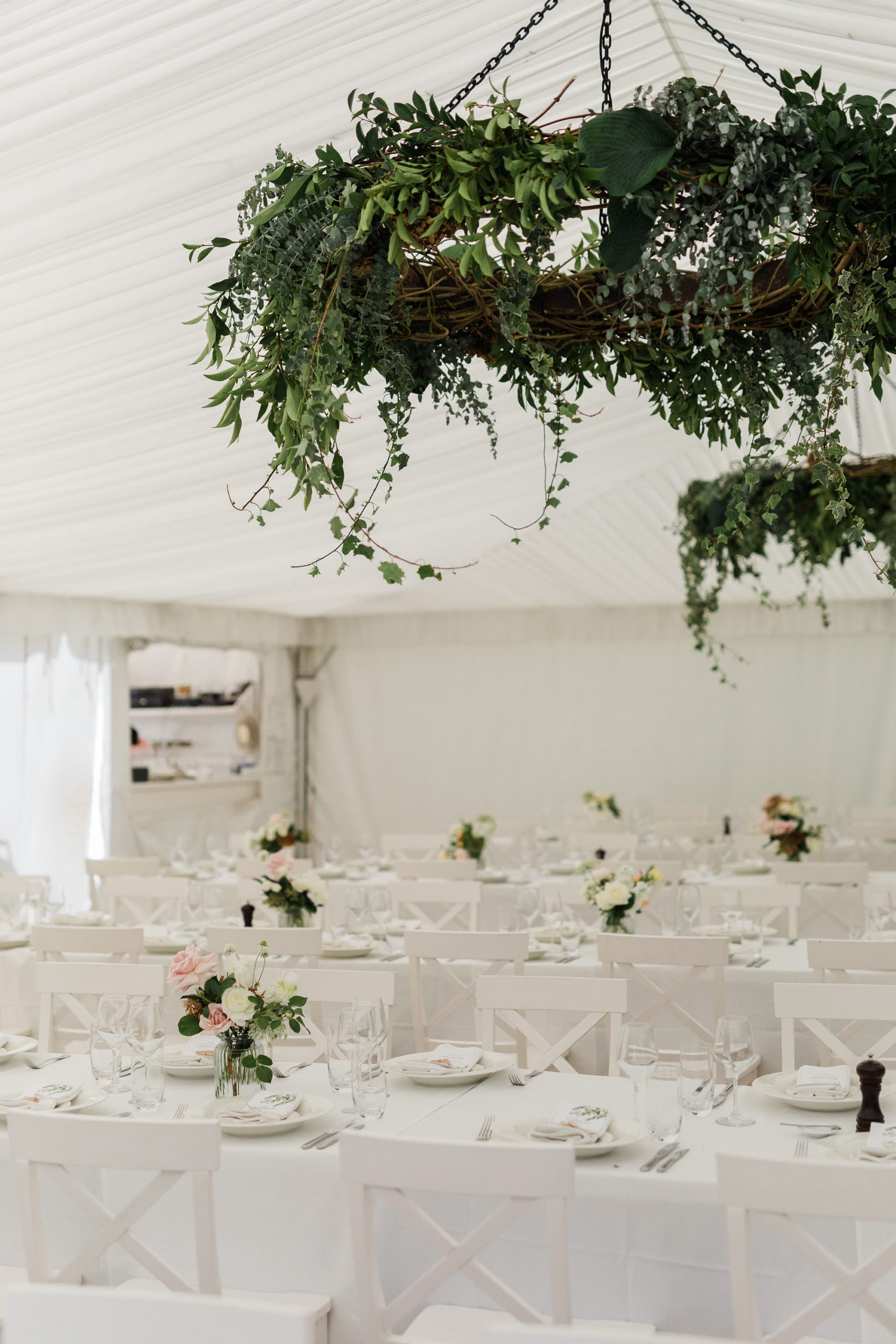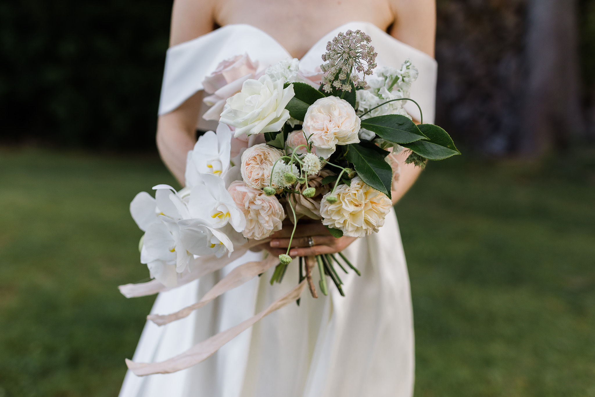 Steph wanted understated elegance for her bouquets… romantic soft roses, delicate orchids with trails of hand dyed ribbons. I created a lush arrangement for the mantelpiece that set the scene for the ceremony and worked perfectly on the head table after the ceremony. Sweet vases of seasonal bloom adorned the guest tables under a pair of fresh foliage and trailing greenery installations suspended from the hanging wreaths. Nature provided the rest of of the decoration – that stunning hydrangea walk is too dreamy.