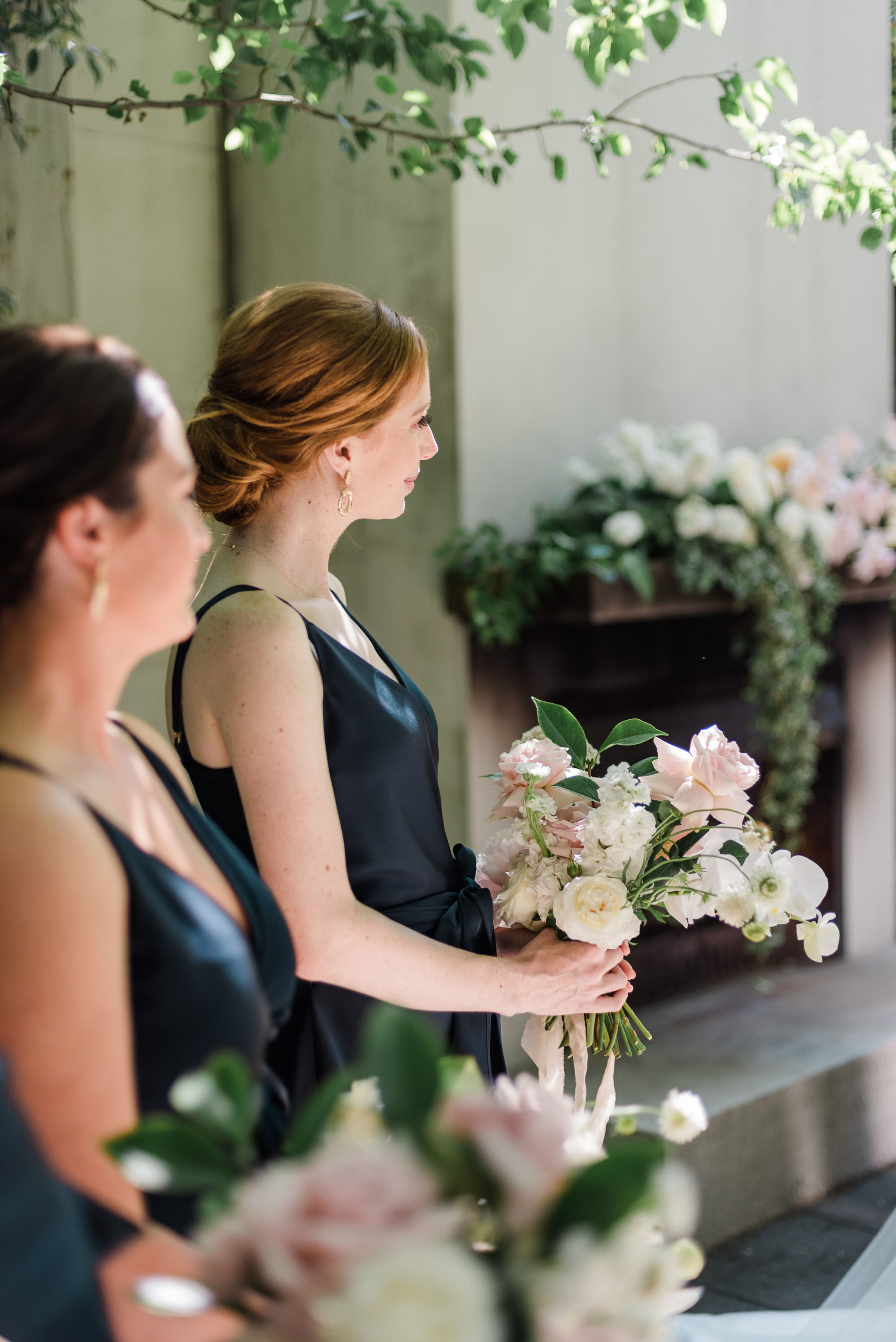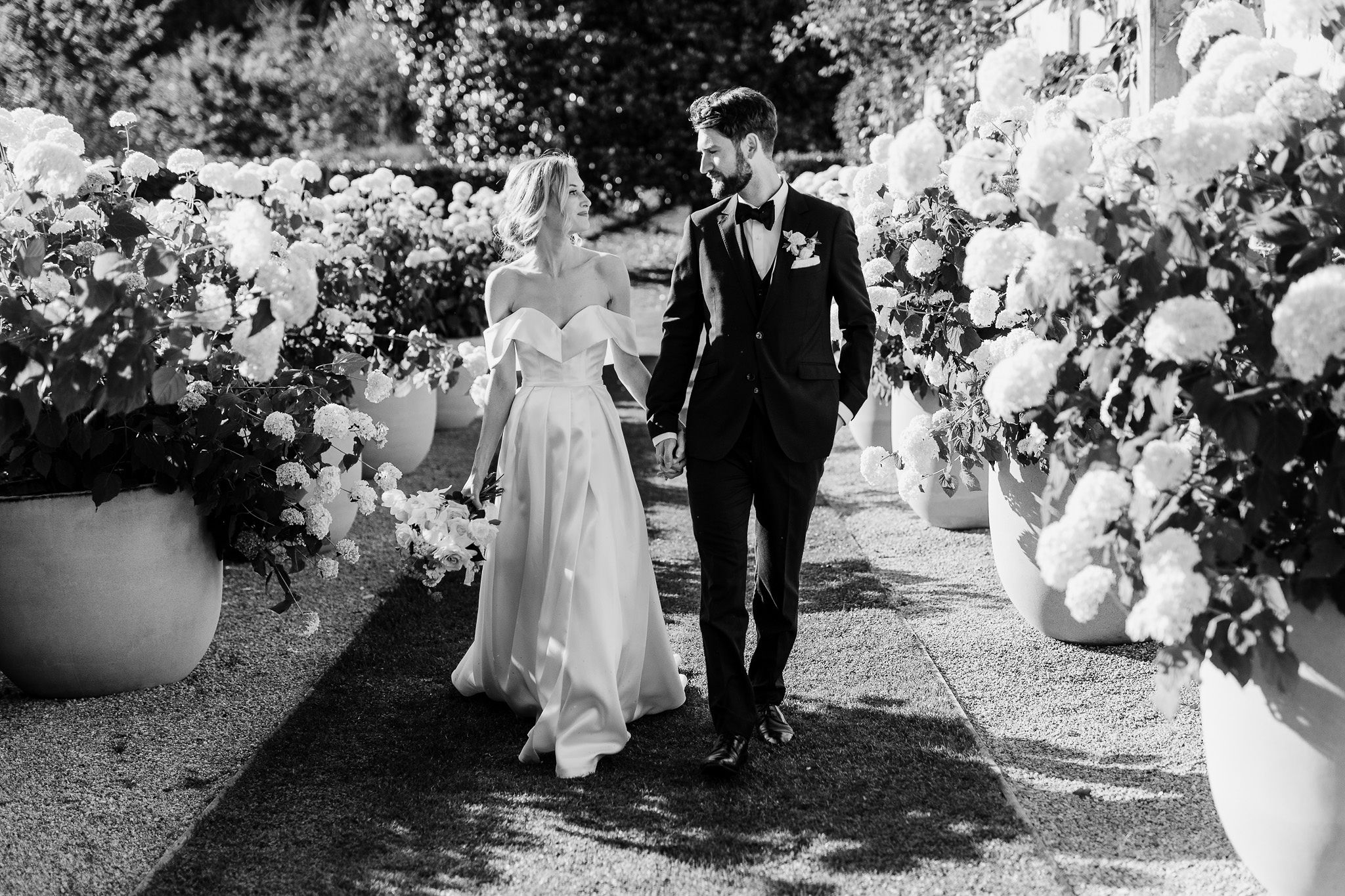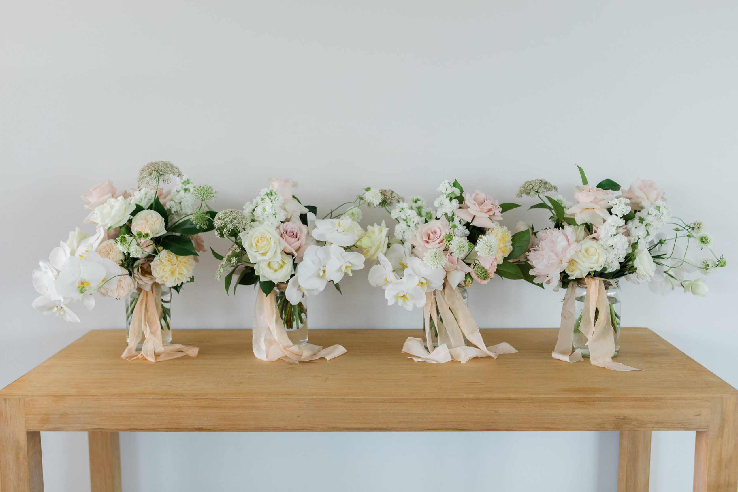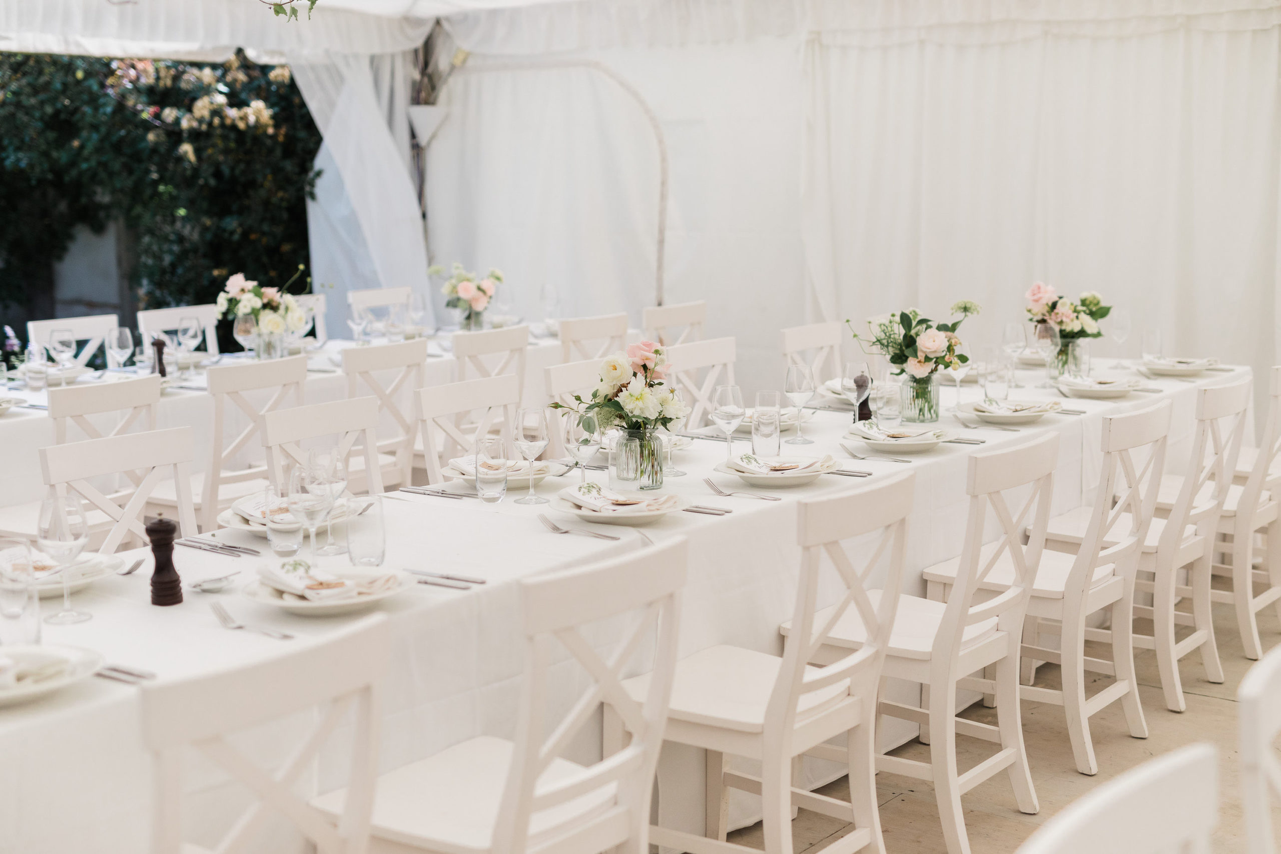 Steph wanted understated elegance for her bouquets… romantic soft roses, delicate orchids with trails of hand dyed ribbons. I created a lush arrangement for the mantelpiece that set the scene for the ceremony and worked perfectly on the head table after the ceremony. Sweet vases of seasonal bloom adorned the guest tables under a pair of fresh foliage and trailing greenery installations suspended from the hanging wreaths. Nature provided the rest of of the decoration – that stunning hydrangea walk is too dreamy.