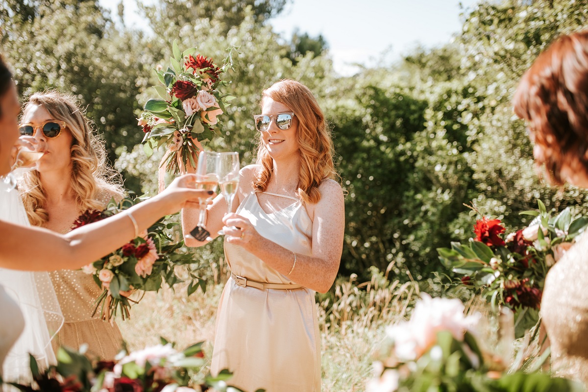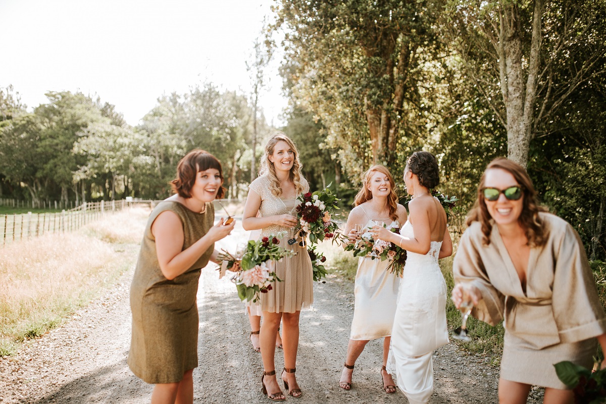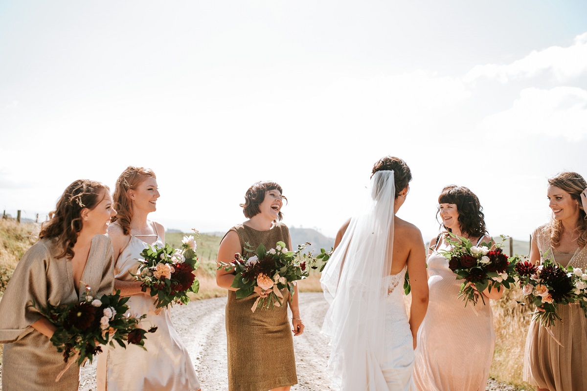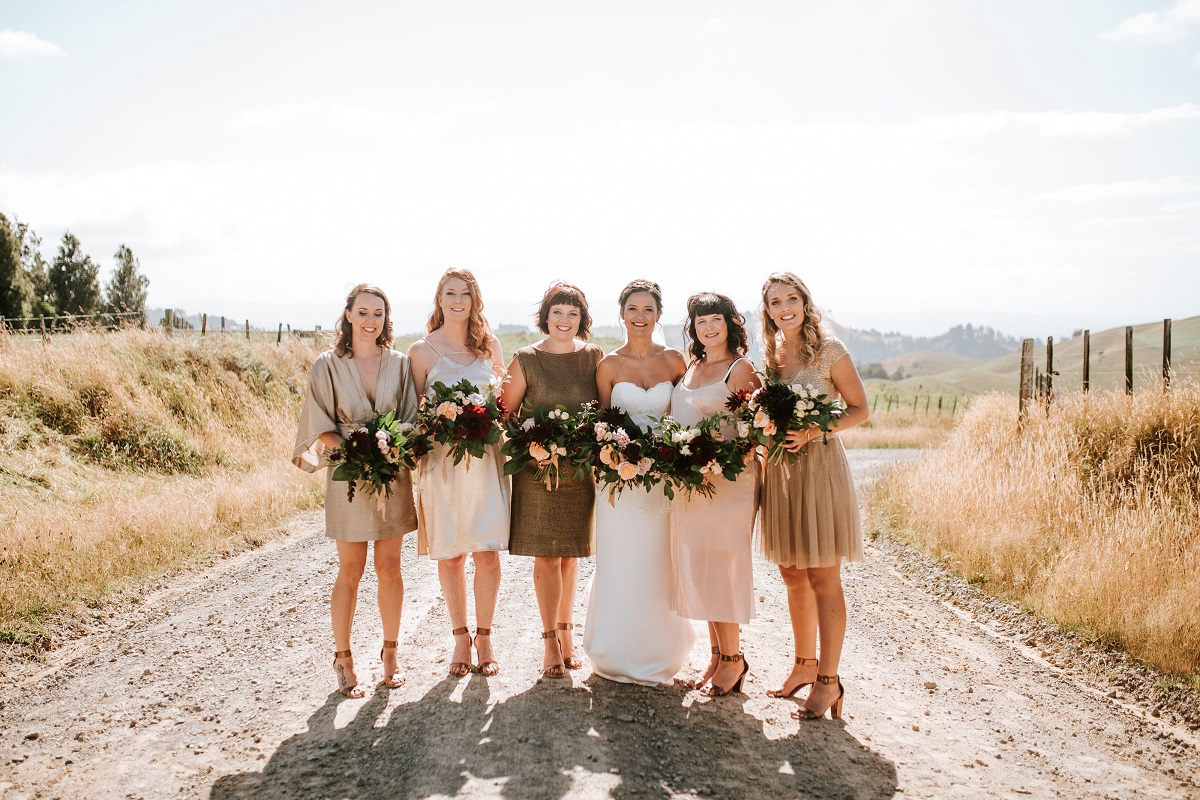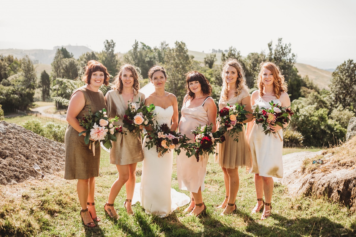 Lorrin and Andrew were married on a stunning day at the end of Summer, high in the hills above Welcome Bay. Lorrin chose five of her closest friends to be her bridesmaids… I love it when bride’s have an abundance of beautiful feminine energy around them on their most important day. The girls wore a mix of dresses in nudes and metallics that paired beautifully with the deep rich reds, blush and peach blooms in the bouquets. I love the way Johanna Macdonald has captured the joy and love of these girls with their bride.