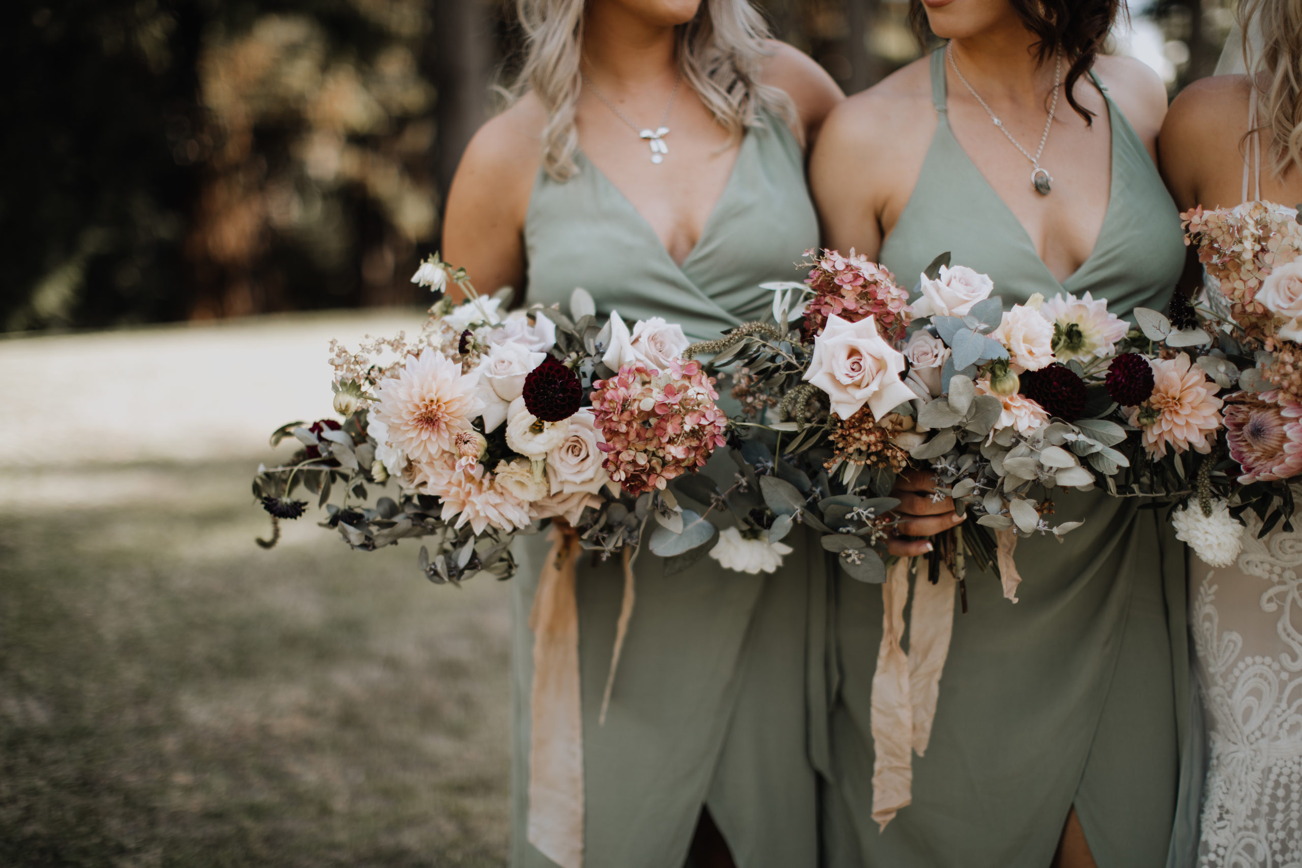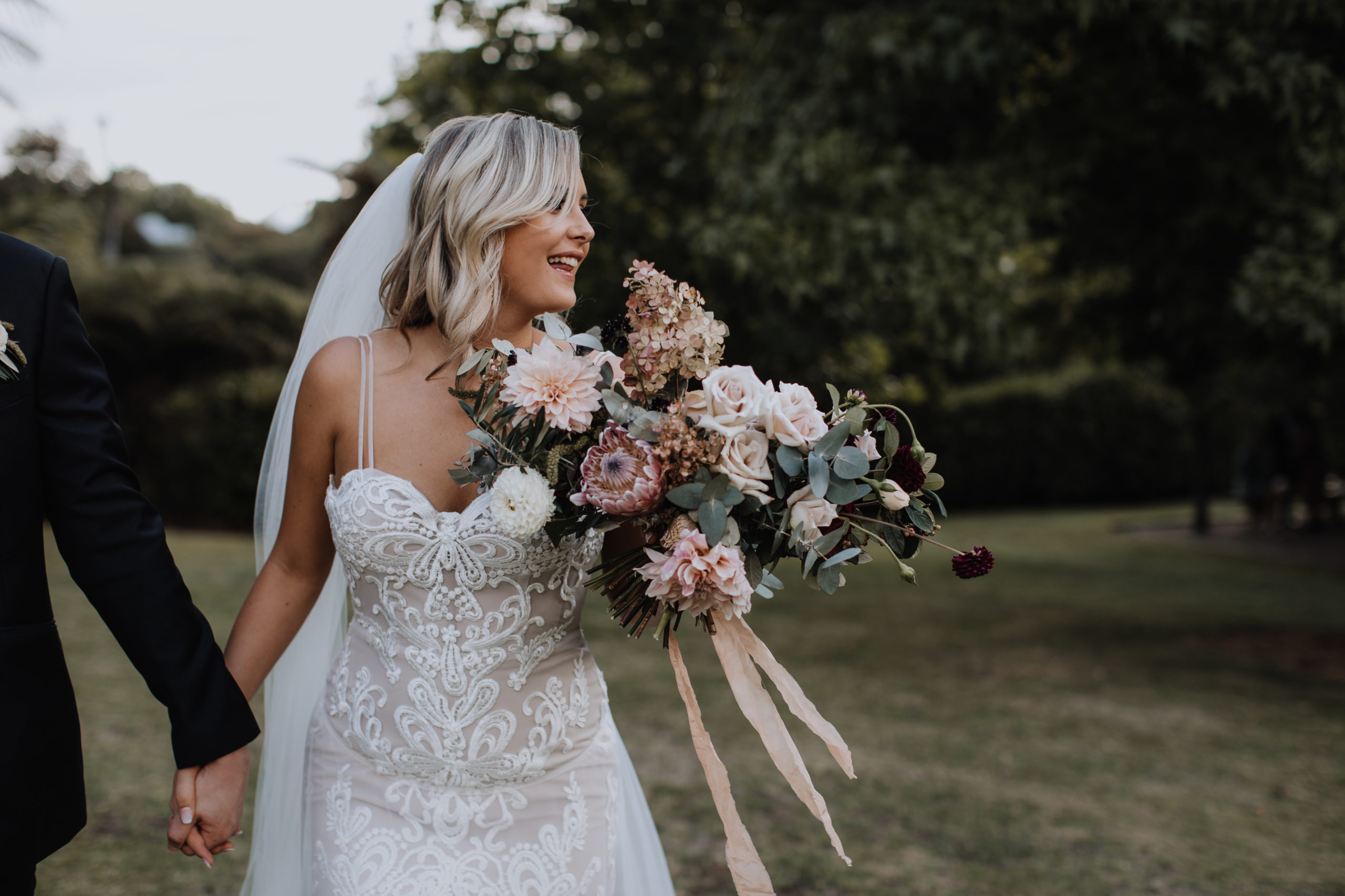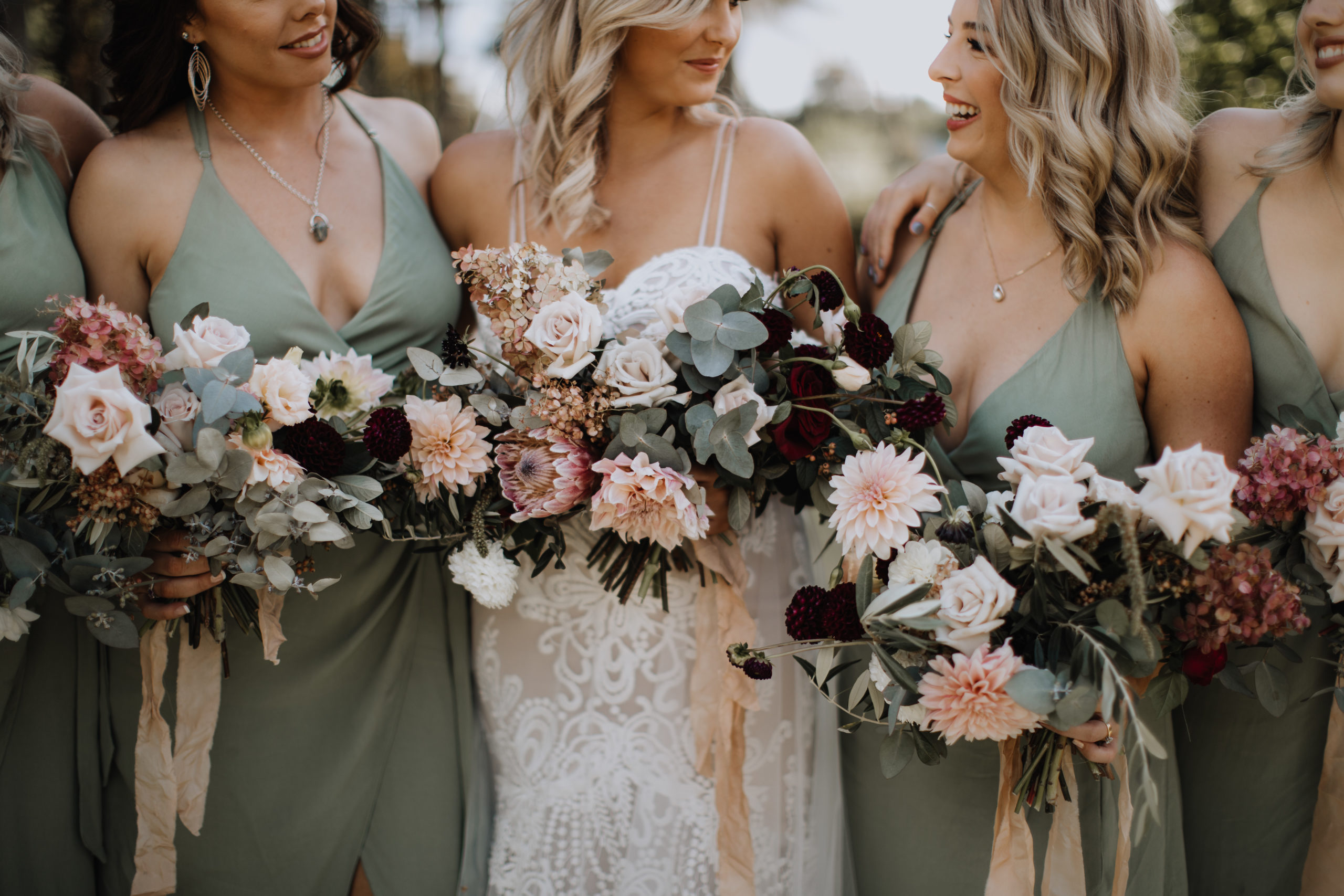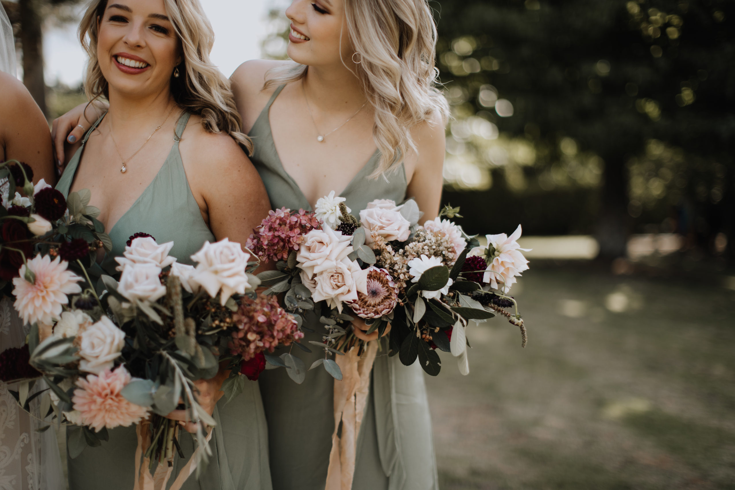 Wanting a muted mix of seasonal tones Shelby choose blooms in faded pinks, soft greens and latte. I chose to use paniculata hydrangeas with a touch of Autumn colour, blush roses, soft proteas foraged trailing goodness and lush muted greenery.